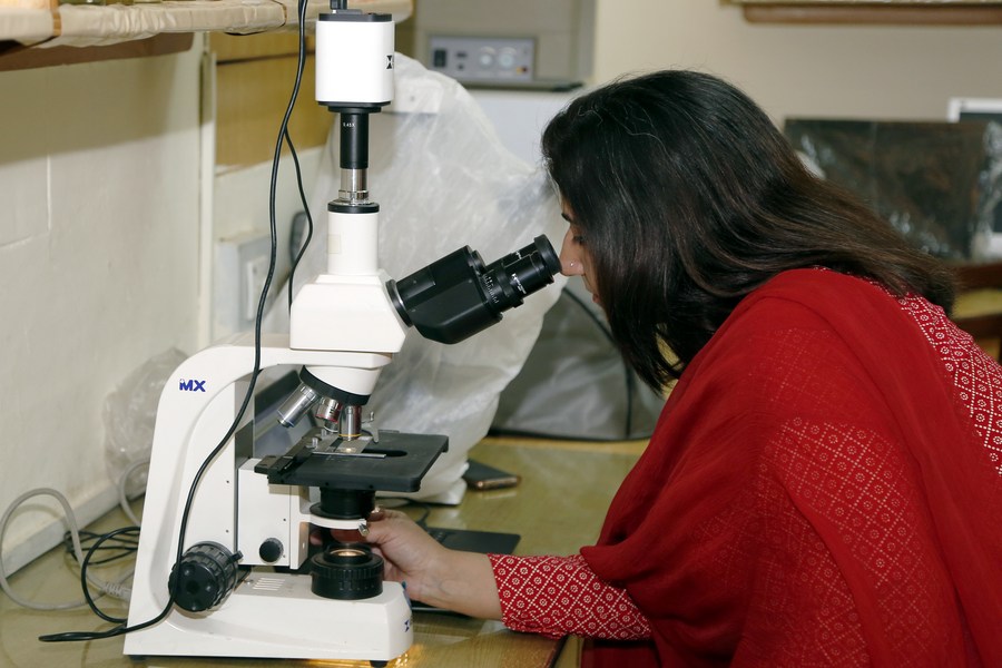 A student of plant sciences observes a lab sample using a microscope at Quaid-i-Azam University in Islamabad, Pakistan, on May 18, 2023. (Xinhua/Ahmad Kamal)