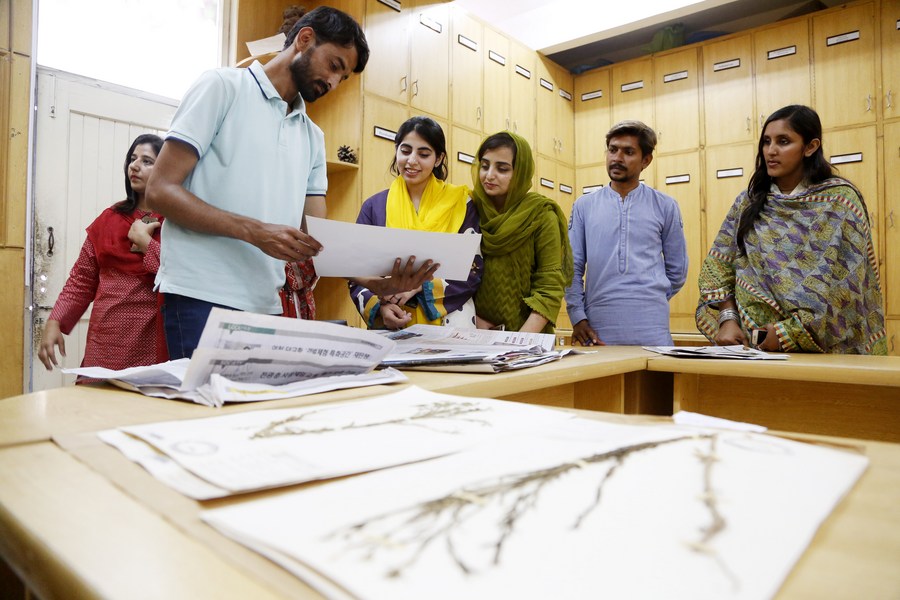 Pakistani students of plant sciences pursuing check specimen of plants used in traditional Chinese medicine (TCM) at Quaid-i-Azam University in Islamabad, capital of Pakistan on May 18, 2023. (Xinhua/Ahmad Kamal)