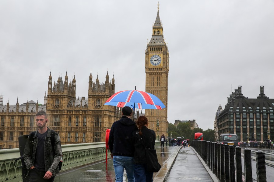A couple shelters from the rain on Westminster Bridge in London, Britain, on Aug. 2, 2023. (Xinhua)