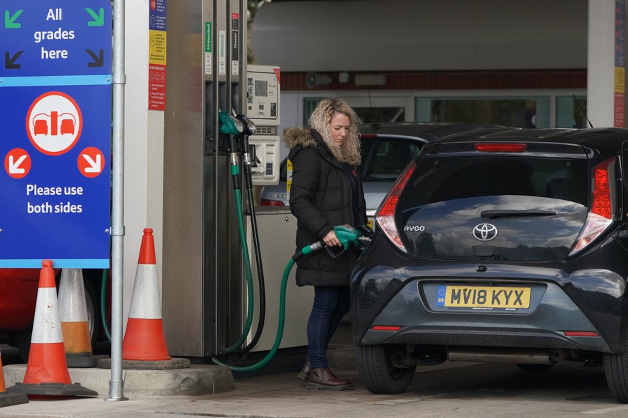 A woman fills up a vehicle at a petrol station in Manchester, Britain, on April 13, 2022. (Photo by Jon Super/Xinhua)