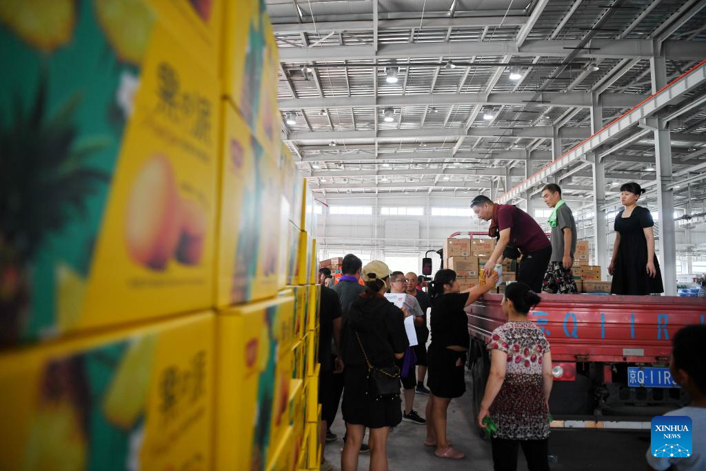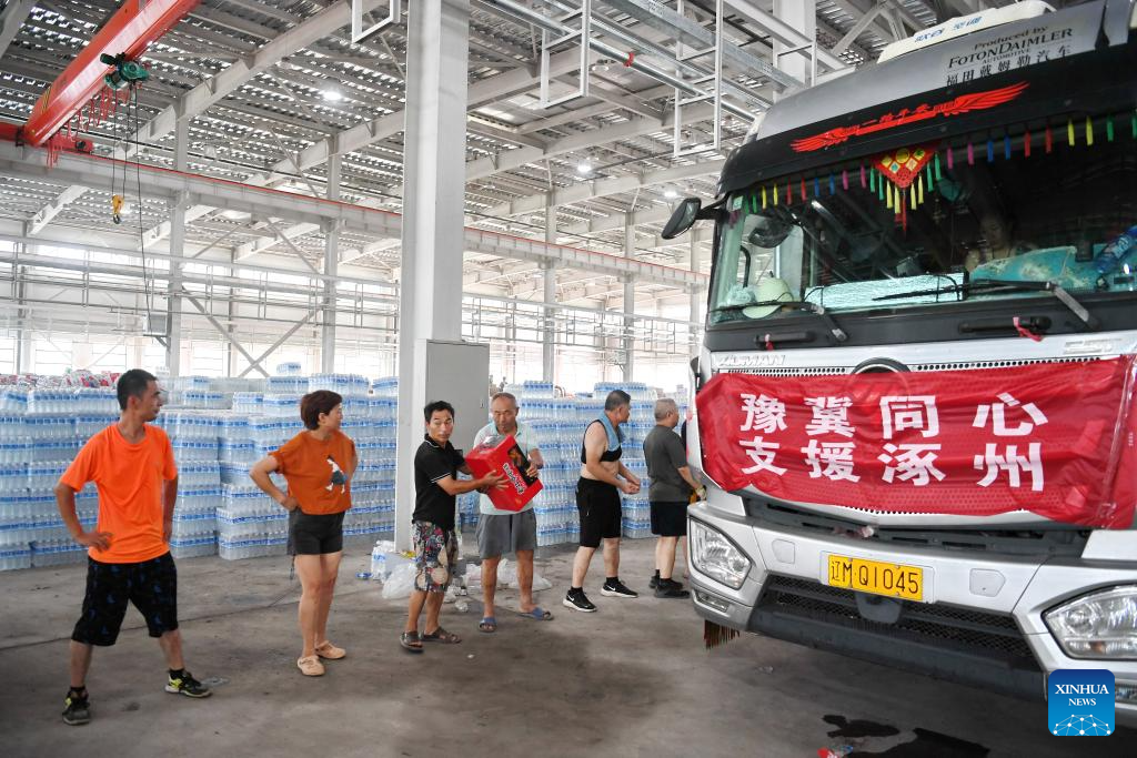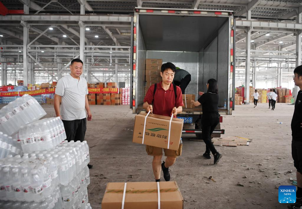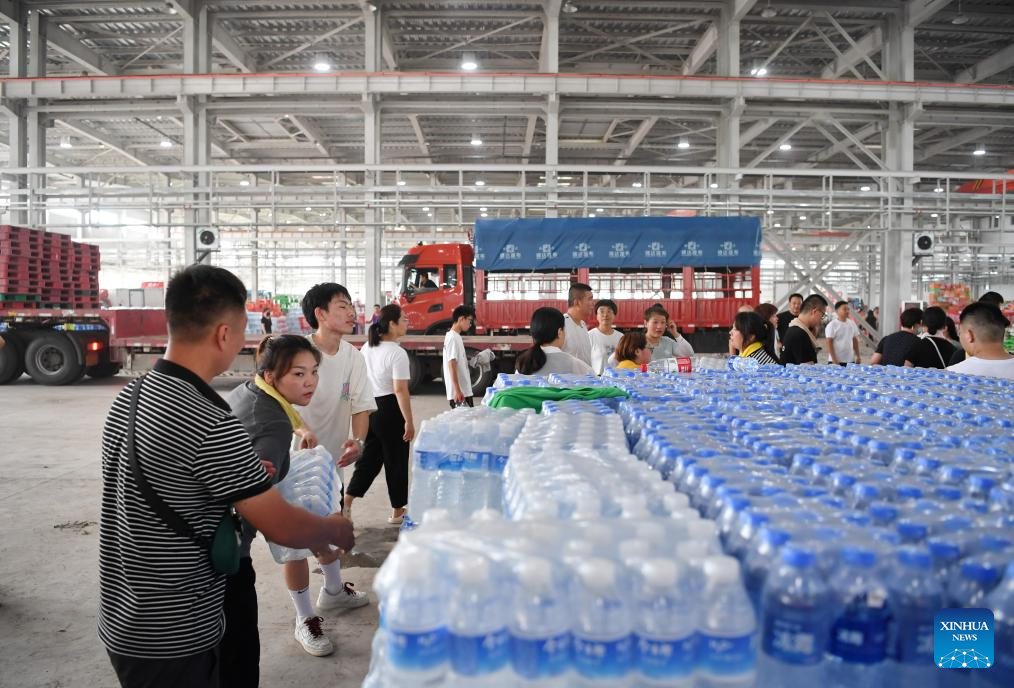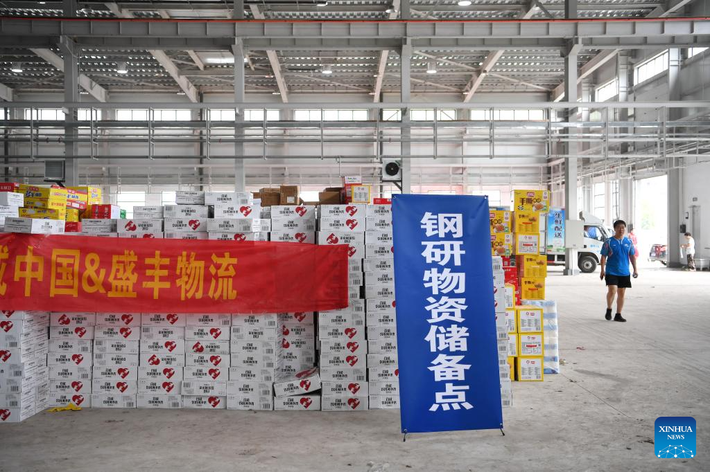 This photo taken on Aug. 5, 2023 shows the donated relief supplies at a storage site of relief supplies in Zhuozhou, north China's Hebei Province. A large number of donated relief supplies from all over the country arrived in Zhuozhou on Saturday, supporting local people affected by rainstorms and floods. (Xinhua/Mu Yu)
