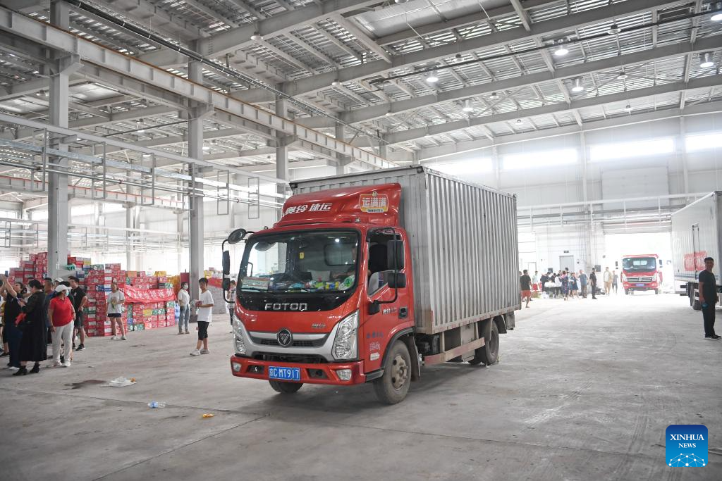 A truck, loaded with donated relief supplies, is seen at a storage site of relief supplies in Zhuozhou, north China's Hebei Province, Aug. 5, 2023. A large number of donated relief supplies from all over the country arrived in Zhuozhou on Saturday, supporting local people affected by rainstorms and floods. (Xinhua/Mu Yu)