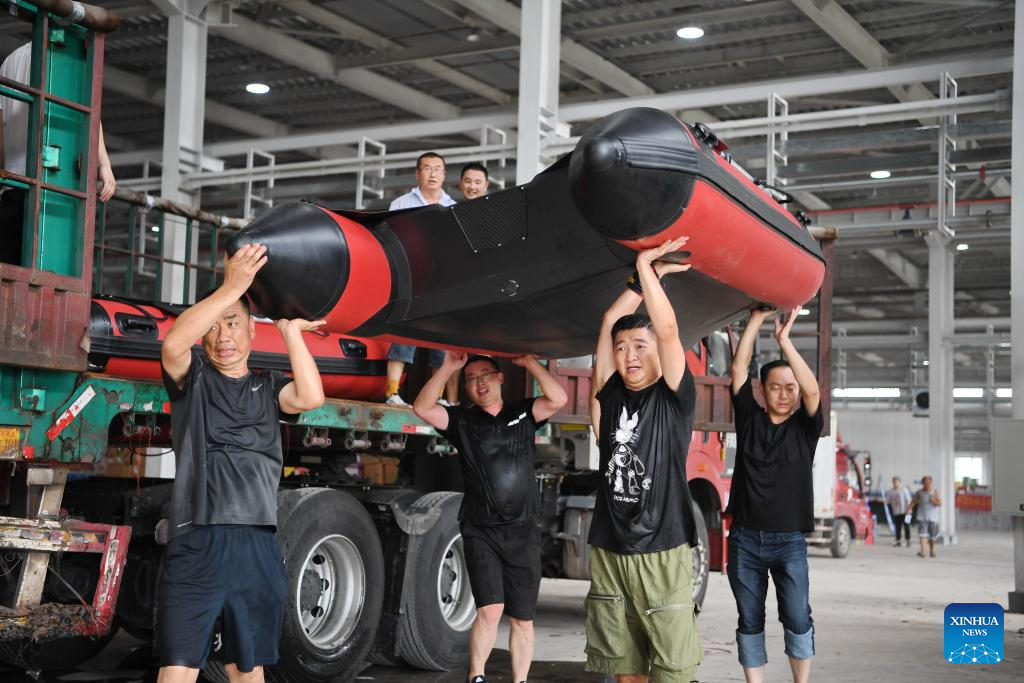 Staff members and volunteers transfer a donated speedboat at a storage site of relief supplies in Zhuozhou, north China's Hebei Province, Aug. 5, 2023. A large number of donated relief supplies from all over the country arrived in Zhuozhou on Saturday, supporting local people affected by rainstorms and floods. (Xinhua/Mu Yu)