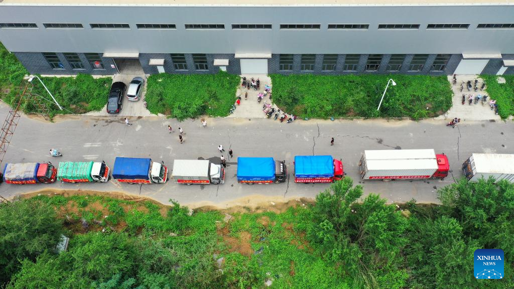 This aerial photo taken on Aug. 5, 2023 shows trucks waiting in line outside a storage site of relief supplies in Zhuozhou, north China's Hebei Province. A large number of donated relief supplies from all over the country arrived in Zhuozhou on Saturday, supporting local people affected by rainstorms and floods. (Xinhua/Mu Yu)