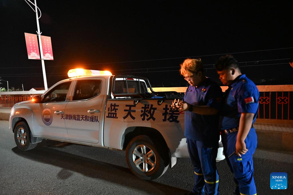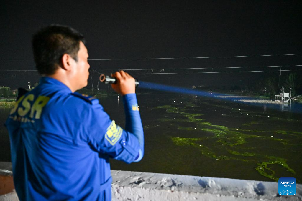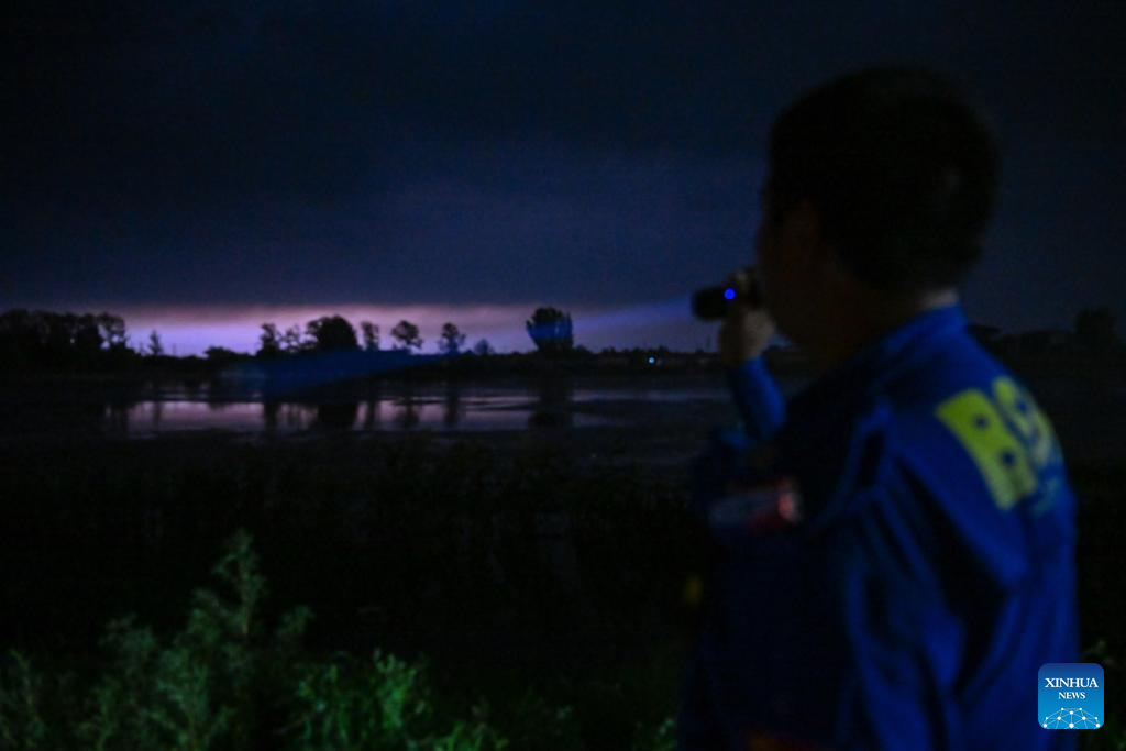 A member of the Blue Sky Rescue Team's Tianjin Jinghai branch checks the river in Taitou Town of Jinghai District, north China's Tianjin Municipality, Aug. 4, 2023. All residents of 18 villages under the administration of the Taitou Town have been evacuated to safety before noon of Aug. 3. All the town's flood rescue teams including members of the armed police force in Tianjin, the Blue Sky Rescue Team, local officials and rescue workers are standing by to brace for flooding from upstream river which is expected to arrive here on Aug. 4. (Xinhua/Sun Fanyue)
