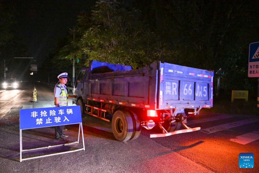 Traffic police officers guide a rescue vehicle to enter a checkpoint in Taitou Town of Jinghai District, north China's Tianjin Municipality, Aug. 4, 2023. All residents of 18 villages under the administration of the Taitou Town have been evacuated to safety before noon of Aug. 3. All the town's flood rescue teams including members of the armed police force in Tianjin, the Blue Sky Rescue Team, local officials and rescue workers are standing by to brace for flooding from upstream river which is expected to arrive here on Aug. 4. (Xinhua/Sun Fanyue)