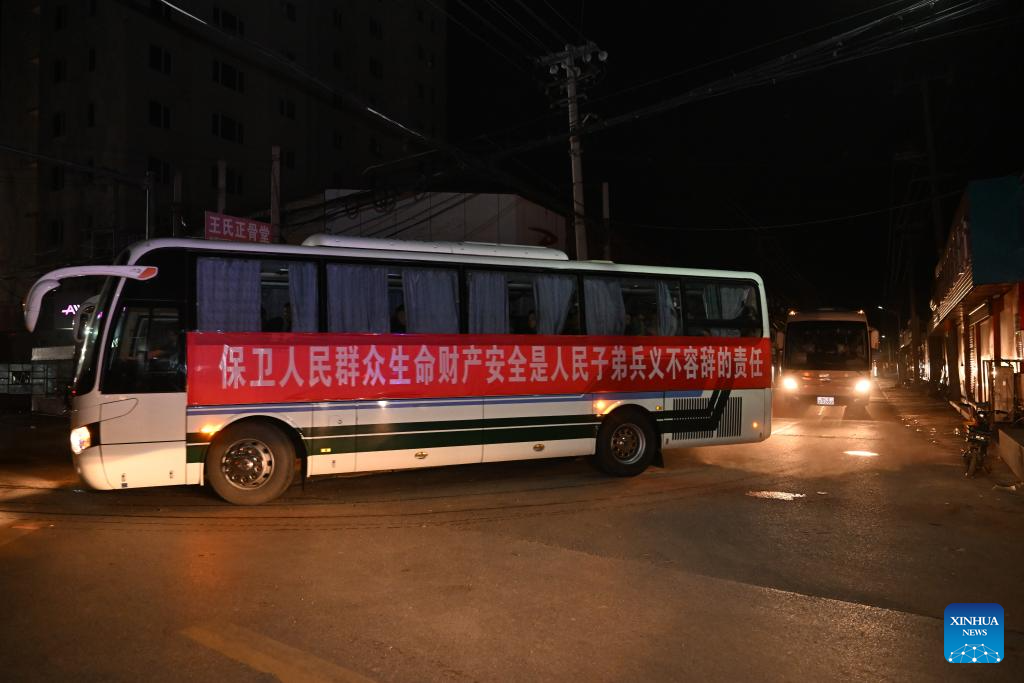Members of the armed police force in Tianjin take bus in Taitou Town of Jinghai District, north China's Tianjin Municipality, Aug. 4, 2023. All residents of 18 villages under the administration of the Taitou Town have been evacuated to safety before noon of Aug. 3. All the town's flood rescue teams including members of the armed police force in Tianjin, the Blue Sky Rescue Team, local officials and rescue workers are standing by to brace for flooding from upstream river which is expected to arrive here on Aug. 4. (Xinhua/Sun Fanyue)