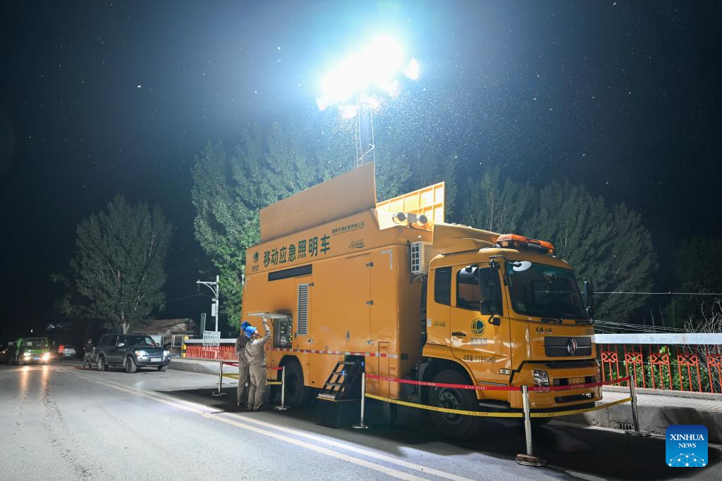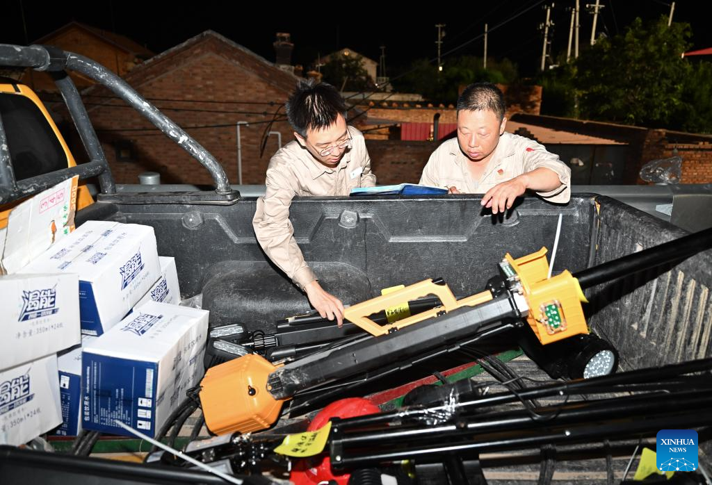 Workers of the State Grid Tianjin Electric Power Company prepare the lighting equipment in Taitou Town of Jinghai District, north China's Tianjin Municipality, Aug. 4, 2023. All residents of 18 villages under the administration of the Taitou Town have been evacuated to safety before noon of Aug. 3. All the town's flood rescue teams including members of the armed police force in Tianjin, the Blue Sky Rescue Team, local officials and rescue workers are standing by to brace for flooding from upstream river which is expected to arrive here on Aug. 4. (Xinhua/Sun Fanyue)
