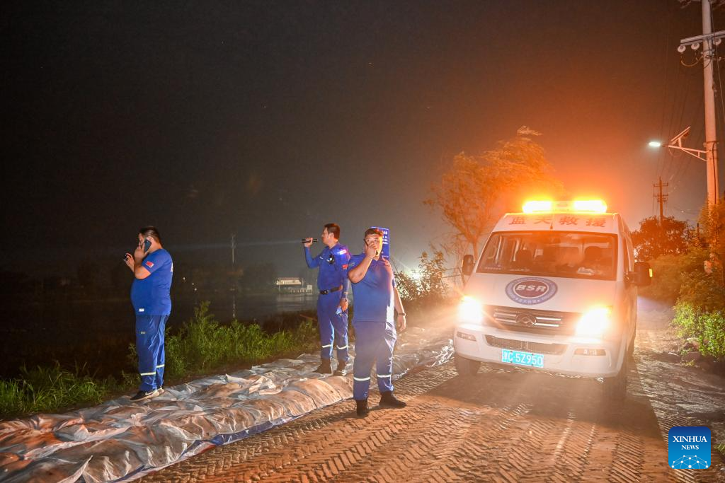 Members of the Blue Sky Rescue Team's Tianjin Jinghai branch and dam patrollers address potential safety hazards on a dam along the Daqing River in Taitou Town of Jinghai District, north China's Tianjin Municipality, Aug. 4, 2023. All residents of 18 villages under the administration of the Taitou Town have been evacuated to safety before noon of Aug. 3. All the town's flood rescue teams including members of the armed police force in Tianjin, the Blue Sky Rescue Team, local officials and rescue workers are standing by to brace for flooding from upstream river which is expected to arrive here on Aug. 4. (Xinhua/Sun Fanyue)