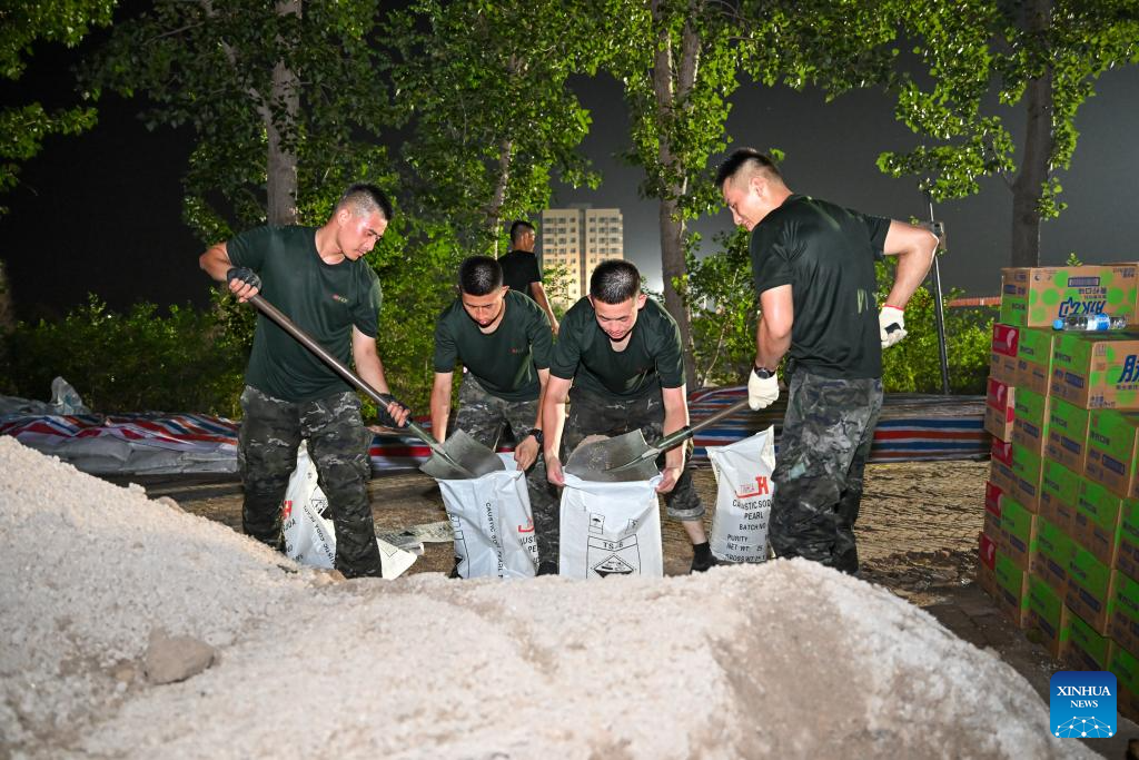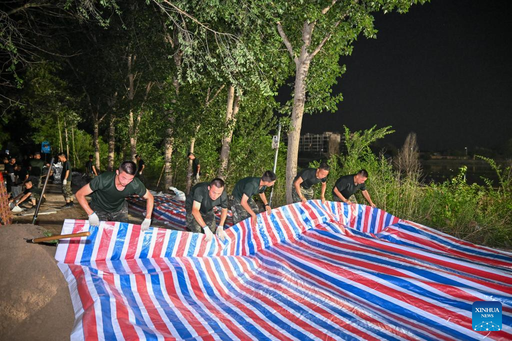 Members of the armed police force in Tianjin strengthen the dams at the Jinghai section of Daqing river, north China's Tianjin Municipality, Aug. 4, 2023. All residents of 18 villages under the administration of the Taitou Town have been evacuated to safety before noon of Aug. 3. All the town's flood rescue teams including members of the armed police force in Tianjin, the Blue Sky Rescue Team, local officials and rescue workers are standing by to brace for flooding from upstream river which is expected to arrive here on Aug. 4. (Xinhua/Sun Fanyue)