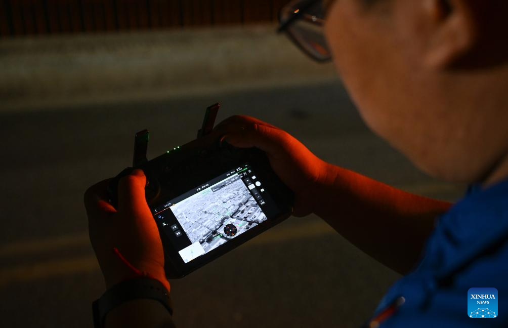 A member of the Blue Sky Rescue Team's Tianjin Jinghai branch uses a thermal drone to check whether all residents are relocated or not in a village of Jinghai District, north China's Tianjin Municipality, Aug. 4, 2023. All residents of 18 villages under the administration of the Taitou Town have been evacuated to safety before noon of Aug. 3. All the town's flood rescue teams including members of the armed police force in Tianjin, the Blue Sky Rescue Team, local officials and rescue workers are standing by to brace for flooding from upstream river which is expected to arrive here on Aug. 4. (Xinhua/Sun Fanyue)