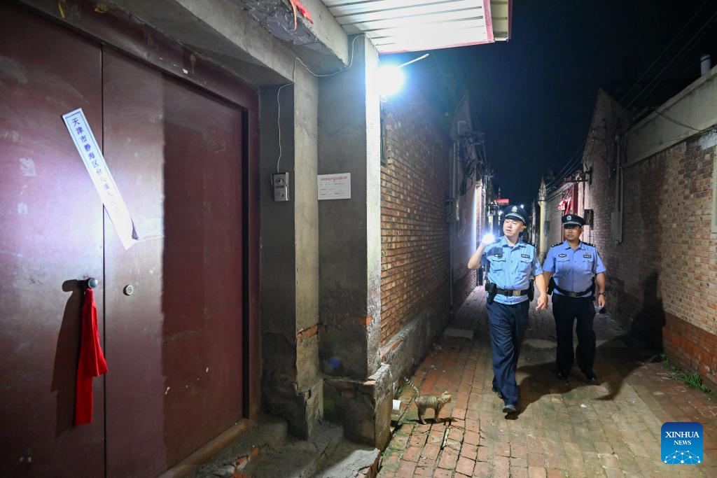 Policemen patrol in a village in Taitou Town of Jinghai District, north China's Tianjin Municipality, Aug. 4, 2023. All residents of 18 villages under the administration of the Taitou Town have been evacuated to safety before noon of Aug. 3. All the town's flood rescue teams including members of the armed police force in Tianjin, the Blue Sky Rescue Team, local officials and rescue workers are standing by to brace for flooding from upstream river which is expected to arrive here on Aug. 4. (Xinhua/Sun Fanyue)