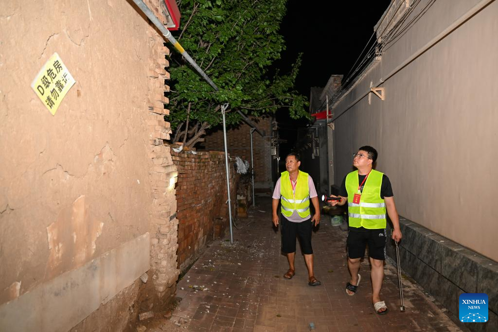 Han Jianxiang (R), secretary of the Communist Party of China branch of Nanerpu Village and director of the Nanerpu Village Committee, and a local official check buildings in Nanerpu Village of Taitou Town, Jinghai District, north China's Tianjin Municipality, Aug. 4, 2023. All residents of 18 villages under the administration of the Taitou Town have been evacuated to safety before noon of Aug. 3. All the town's flood rescue teams including members of the armed police force in Tianjin, the Blue Sky Rescue Team, local officials and rescue workers are standing by to brace for flooding from upstream river which is expected to arrive here on Aug. 4. (Xinhua/Sun Fanyue)
