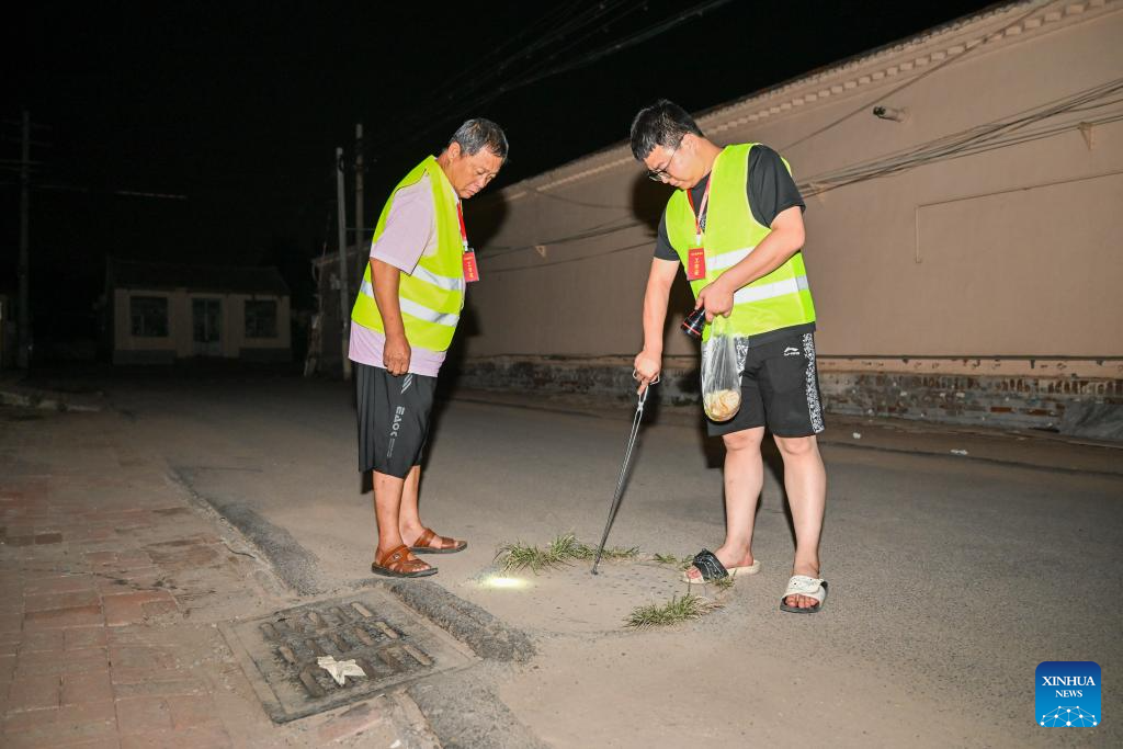 Han Jianxiang (R), secretary of the Communist Party of China branch of Nanerpu Village and director of the Nanerpu Village Committee, and a local official inspect a manhole cover in Nanerpu village of Taitou Town, Jinghai District, north China's Tianjin Municipality, Aug. 4, 2023. All residents of 18 villages under the administration of the Taitou Town have been evacuated to safety before noon of Aug. 3. All the town's flood rescue teams including members of the armed police force in Tianjin, the Blue Sky Rescue Team, local officials and rescue workers are standing by to brace for flooding from upstream river which is expected to arrive here on Aug. 4. (Xinhua/Sun Fanyue)
