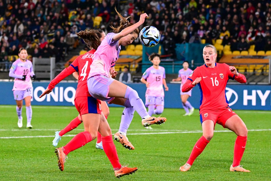 Mina Tanaka (L, front) of Japan vies with Ingrid Syrstad Engen (R, front) of Norway during their round of 16 match at the FIFA Women's World Cup 2023 in Wellington, New Zealand, Aug. 5, 2023. (Xinhua/Zhu Wei)