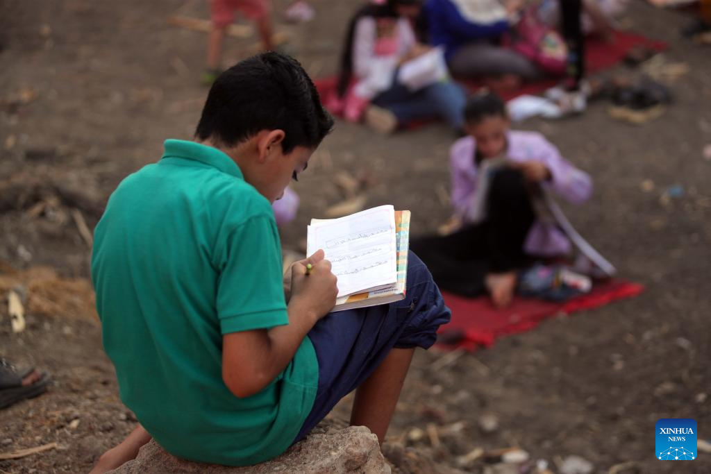 A boy studies outside Mohamed Abel-Aziz's house which was turned into a public library at Bishat Amer village in Sharqia Province, Egypt, July 28, 2023. (Xinhua/Ahmed Gomaa)