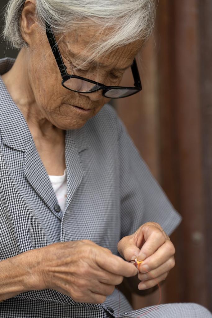 Liang Ailian, an 85-year-old villager, makes an embroidered ball in Jiuzhou Village of Jingxi City, south China's Guangxi Zhuang Autonomous Region, Aug. 2, 2023. (Xinhua/Fei Maohua)