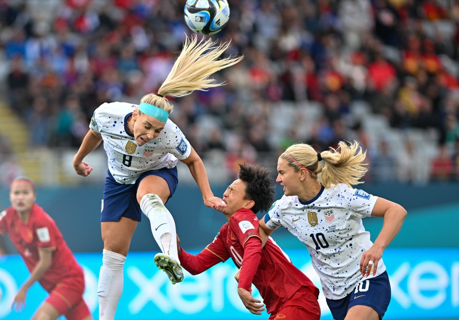 Julie Ertz (2nd L) of the United States heads the ball during the Group E match against Vietnam at the FIFA Women's World Cup in Auckland, New Zealand, July 22, 2023. (Xinhua/Guo Lei)