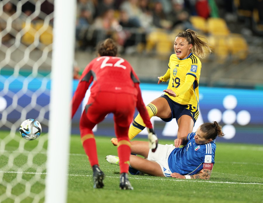 Johanna Rytting-Kaneryd (R, top) of Sweden shoots during the group G match against Italy at the 2023 FIFA Women's World Cup in Wellington, New Zealand, July 29, 2023. (Xinhua/Qin Lang)