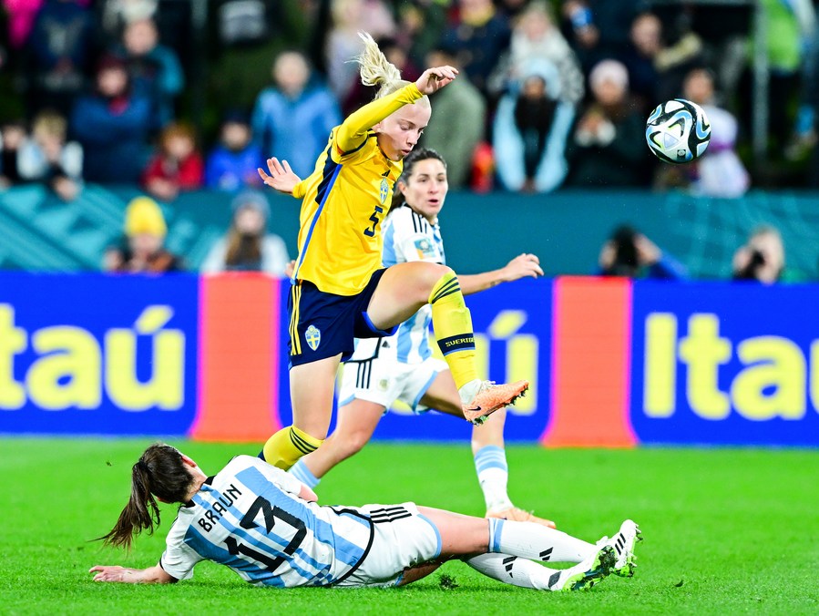 Anna Sandberg of Sweden breaks through during the Group G match against Argentina at the 2023 FIFA Women's World Cup in Hamilton, New Zealand, Aug. 2, 2023. (Xinhua/Zhu Wei)