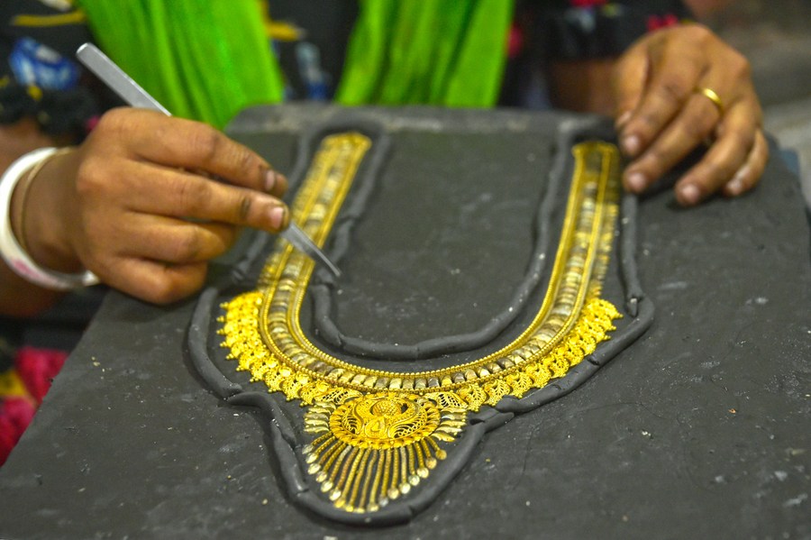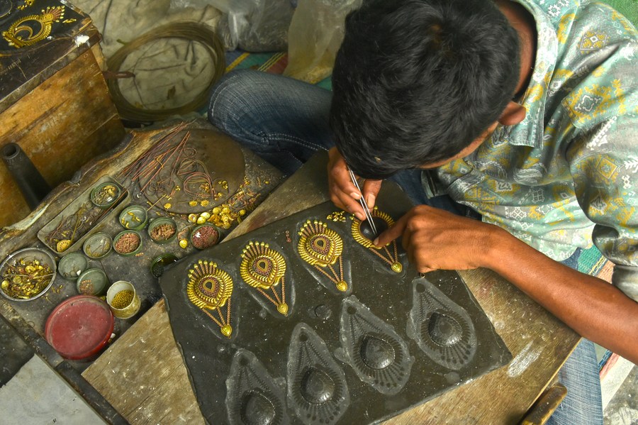 An artisan makes components of a jewelry product at his workshop at Vakurta village in Savar, on the outskirts of Dhaka, Bangladesh on Aug. 2, 2023. (Xinhua)