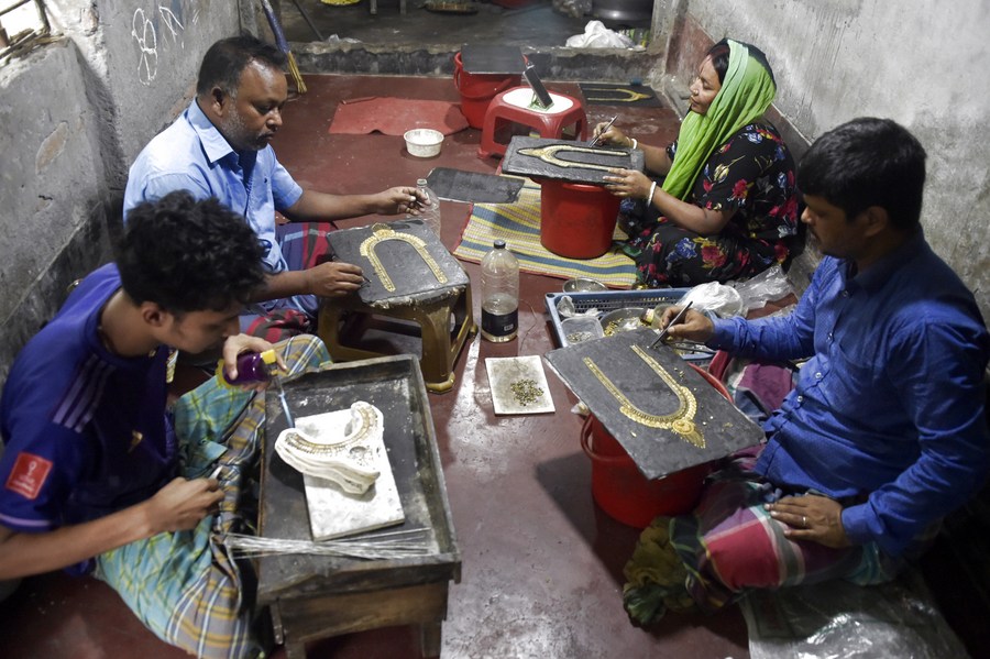 Artisans make handcrafted jewelry at Vakurta village in Savar, on the outskirts of Dhaka, Bangladesh on Aug. 2, 2023. (Xinhua)