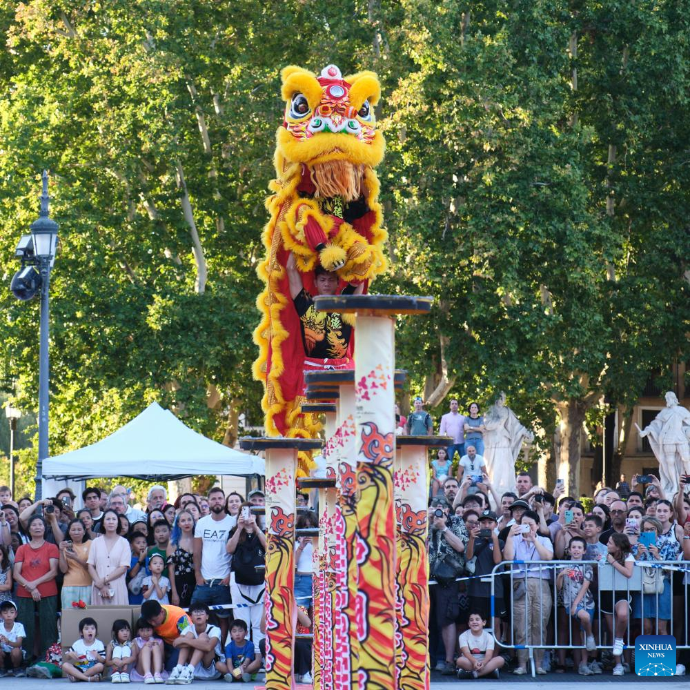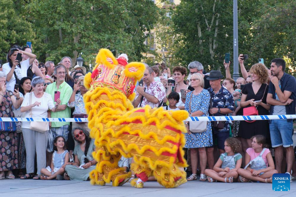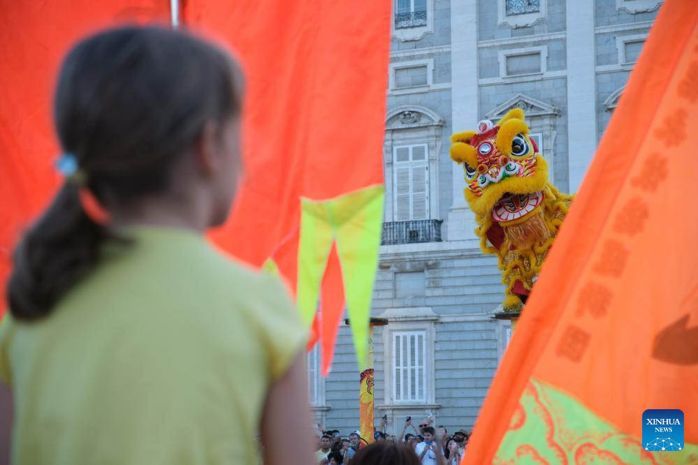 People watch lion dance at the Plaza de Oriente (Eastern Plaza) in Madrid, Spain, on Aug. 5, 2023. The Shenzhen Fuyong Huaide Lion Dance Troupe performed on the streets of Madrid from Friday to Sunday at the invitation of the Madrid Summer in the City Festival and the Chinese Cultural Center in Madrid. (Xinhua/Meng Dingbo)