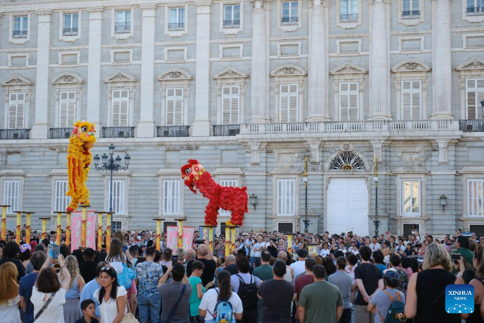 Actors perform lion dance at the Plaza de Oriente (Eastern Plaza) in Madrid, Spain, on Aug. 5, 2023. The Shenzhen Fuyong Huaide Lion Dance Troupe performed on the streets of Madrid from Friday to Sunday at the invitation of the Madrid Summer in the City Festival and the Chinese Cultural Center in Madrid. (Xinhua/Meng Dingbo)
