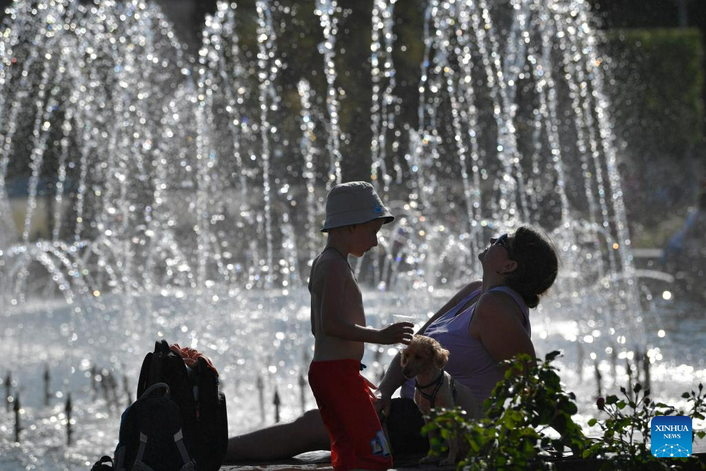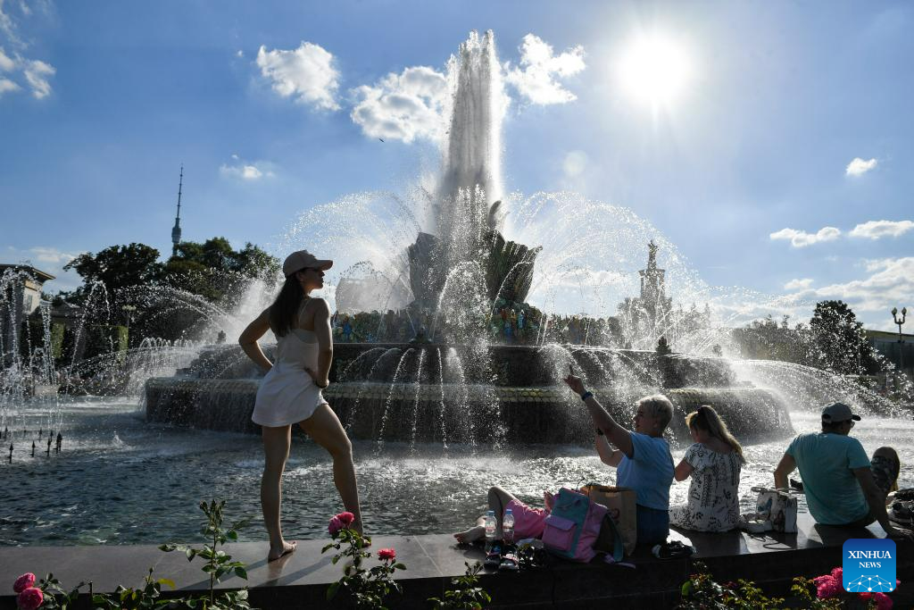 People cool themselves off by a fountain at VDNH (The Exhibition of Achievements of National Economy) in Moscow, Russia, on Aug. 5, 2023. (Photo by Alexander Zemlianichenko Jr/Xinhua)
