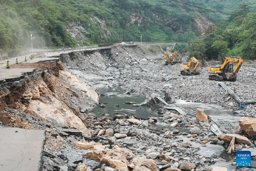 Large machineries carry out restoration work in Shijiaying Town of Fangshan District in Beijing, capital of China, Aug. 6, 2023. Beijing has been speeding up the restoration of roads damaged in flood-hit areas, to assist with rescue and relief efforts. (Xinhua/Ju Huanzong)