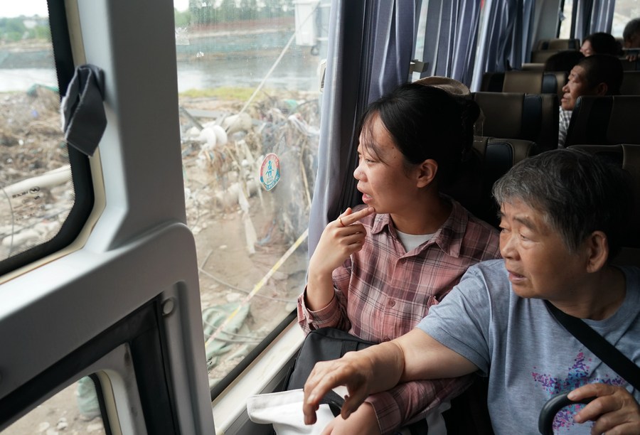 Villagers take a bus to leave a settlement site and return to their homes in Koutou Village of Qinglonghu Town in Fangshan District of Beijing, capital of China, Aug. 5, 2023. (Xinhua/Zhang Chenlin)