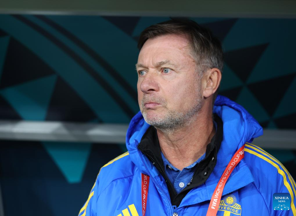 Sweden's head coach Peter Gerhardsson reacts before the round of 16 match between Sweden and the United States at the 2023 FIFA Women's World Cup in Melbourne, Australia, Aug. 6, 2023. (Xinhua/Ding Xu)