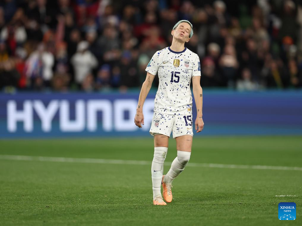 Megan Rapinoe of the United States fails to score a kick during the penalty shoot-out of the round of 16 match between Sweden and the United States at the 2023 FIFA Women's World Cup in Melbourne, Australia, Aug. 6, 2023. (Xinhua/Ding Xu)