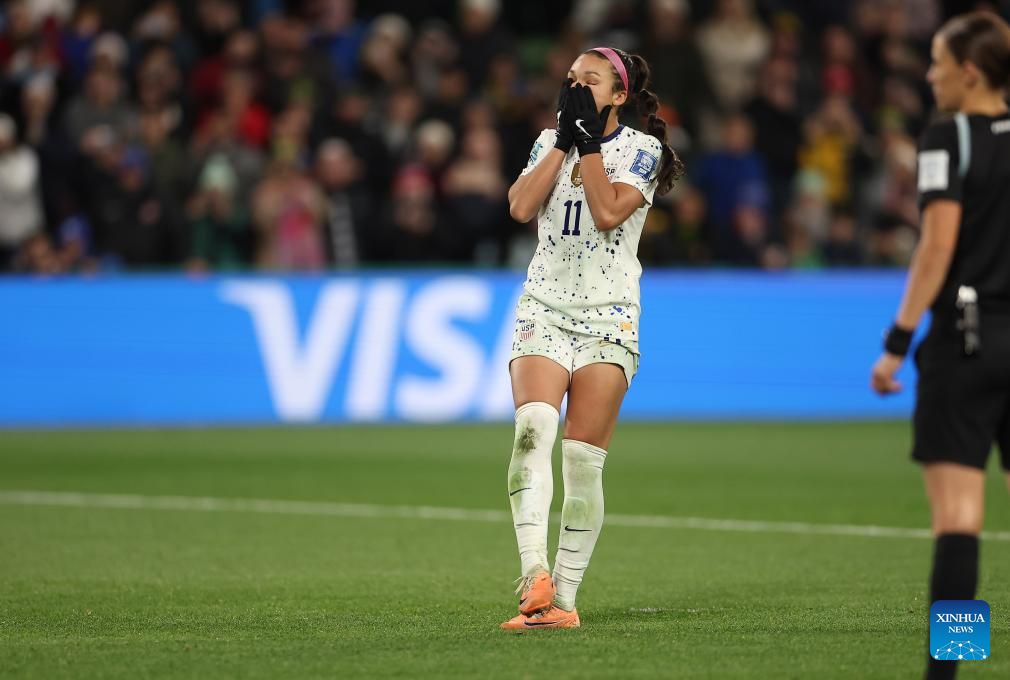 Sophia Smith of the United States fails to score a kick during the penalty shoot-out of the round of 16 match between Sweden and the United States at the 2023 FIFA Women's World Cup in Melbourne, Australia, Aug. 6, 2023. (Xinhua/Ding Xu)