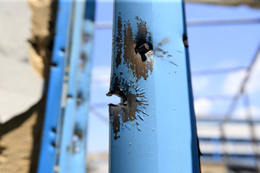This photo taken on Aug. 4, 2023 shows bullet holes left in armed clashes in the Ain Al-Helweh Palestinian refugee camp in Sidon, southern Lebanon. (Photo by Ali Hashisho/Xinhua)