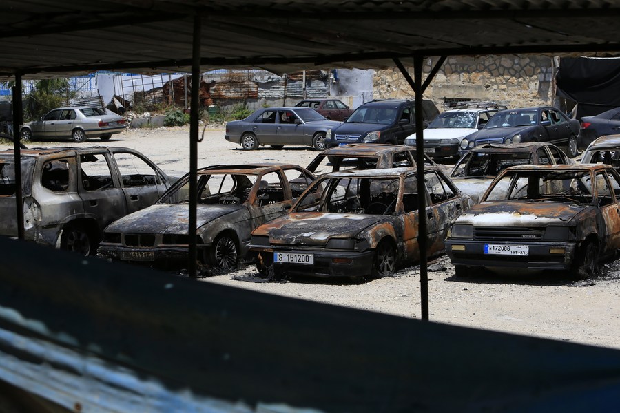 This photo taken on Aug. 4, 2023 shows cars burnt down in armed clashes in the Ain Al-Helweh Palestinian refugee camp in Sidon, southern Lebanon. (Photo by Ali Hashisho/Xinhua)■