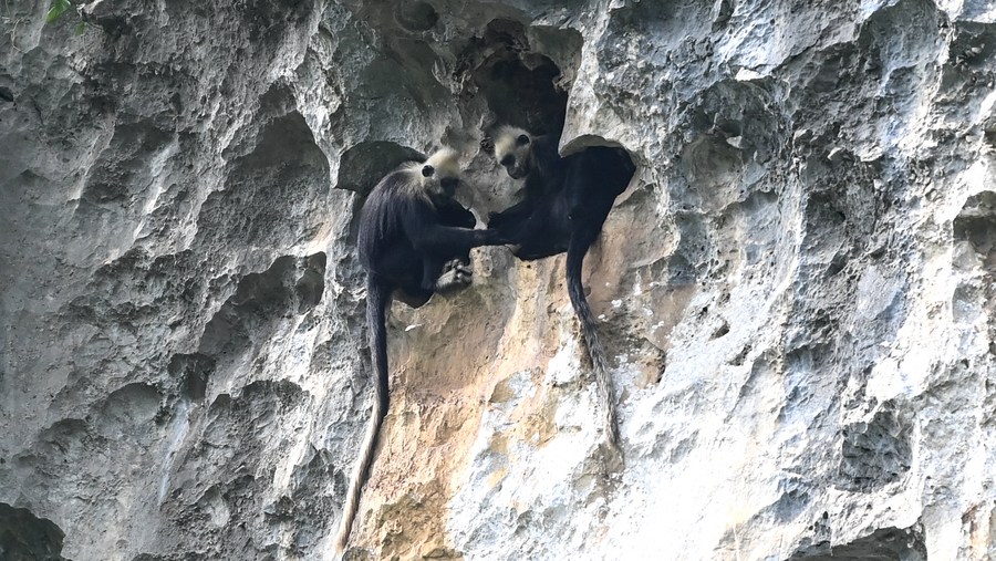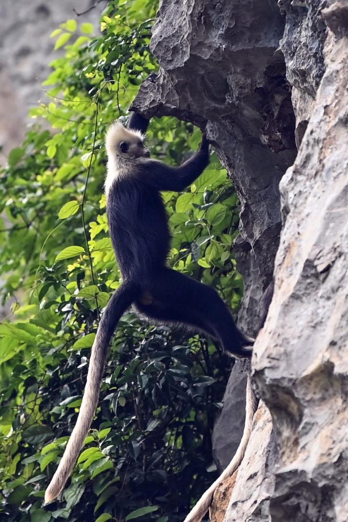 A white-headed langur climbs on a cliff to forage at a national nature reserve in Luobai Town of Jiangzhou District, Chongzuo City, south China's Guangxi Zhuang Autonomous Region, Aug. 5, 2023. (Xinhua/Zhang Ailin)