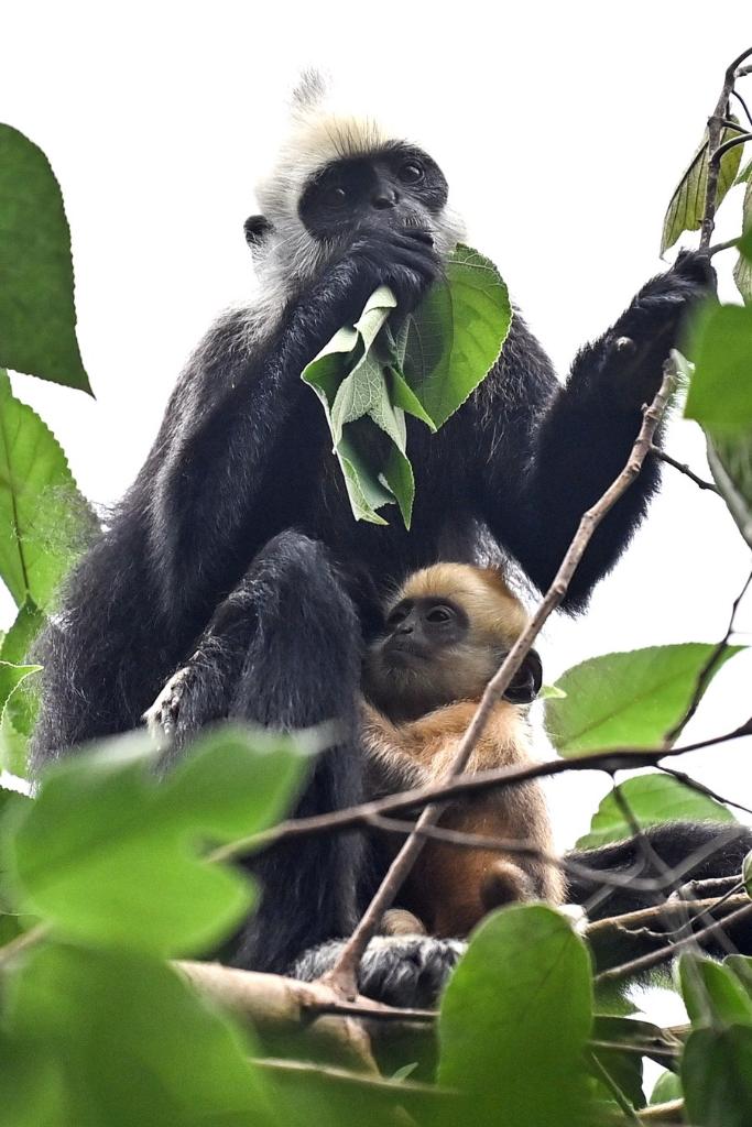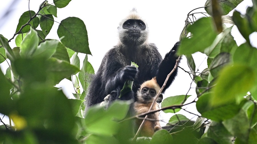 A white-headed langur is pictured with its baby on a tree branch at a national nature reserve in Luobai Town of Jiangzhou District, Chongzuo City, south China's Guangxi Zhuang Autonomous Region, Aug. 4, 2023. (Xinhua/Zhang Ailin)