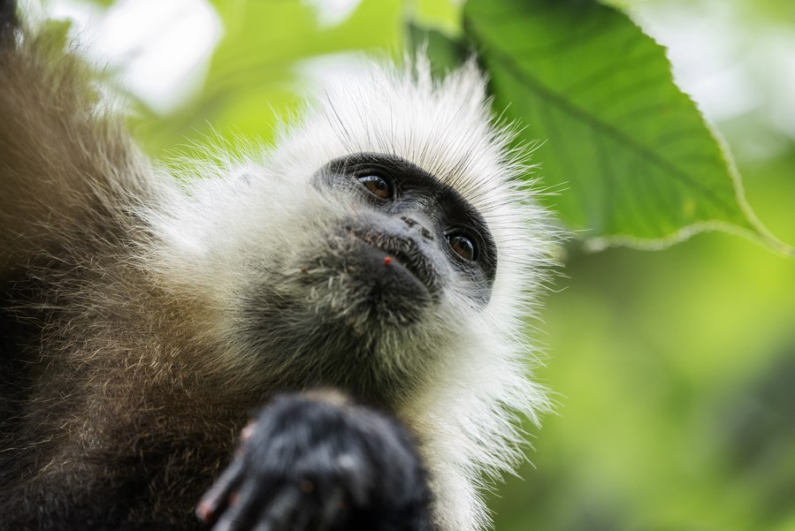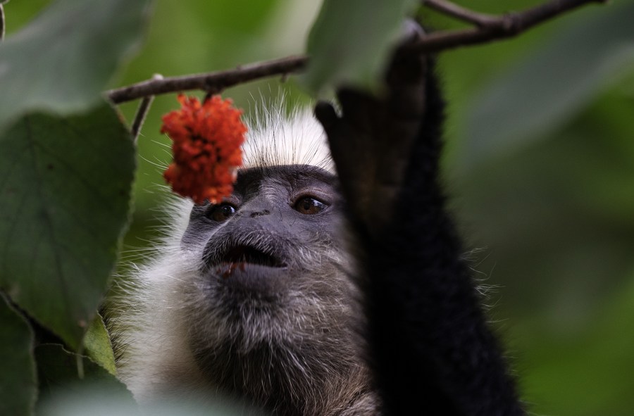 A white-headed langur forages at a national nature reserve in Luobai Town of Jiangzhou District, Chongzuo City, south China's Guangxi Zhuang Autonomous Region, Aug. 4, 2023. (Xinhua/Fei Maohua)
