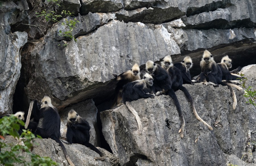 A flock of white-headed langurs rest on a cliff at a national nature reserve in Luobai Town of Jiangzhou District, Chongzuo City, south China's Guangxi Zhuang Autonomous Region, Aug. 5, 2023. (Xinhua/Fei Maohua)