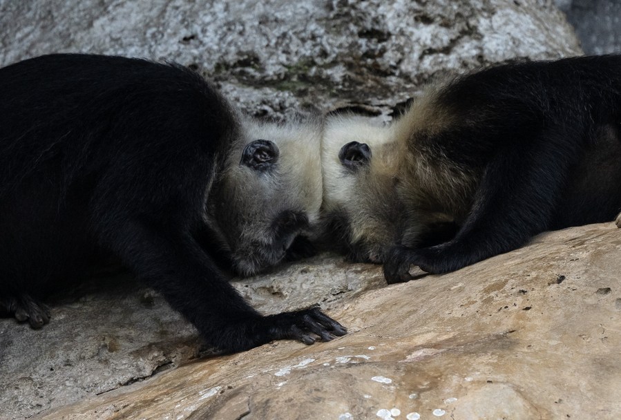 Two white-headed langurs rest on a cliff at a national nature reserve in Luobai Town of Jiangzhou District, Chongzuo City, south China's Guangxi Zhuang Autonomous Region, Aug. 5, 2023. (Xinhua/Fei Maohua)