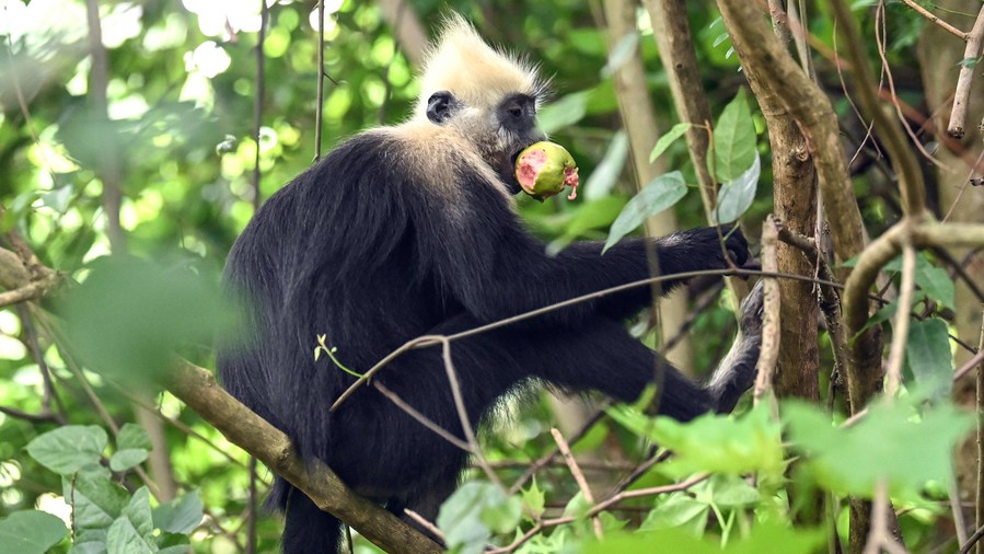A white-headed langur eats guava at a national nature reserve in Luobai Town of Jiangzhou District, Chongzuo City, south China's Guangxi Zhuang Autonomous Region, Aug. 4, 2023. (Xinhua/Zhang Ailin)■