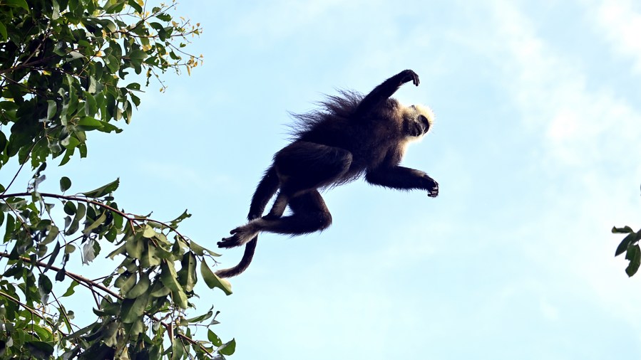 A white-headed langur leaps at a national nature reserve in Luobai Town of Jiangzhou District, Chongzuo City, south China's Guangxi Zhuang Autonomous Region, Aug. 5, 2023. (Xinhua/Zhang Ailin)