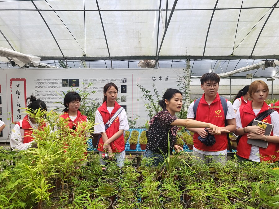 Ao Qingui shares orchid knowledge with college students in the plantation base in Pengxiang Village of Sanjiao Township, Qijiang District, southwest China's Chongqing Municipality on June 29, 2023. (Xinhua/Chen Qingbing)