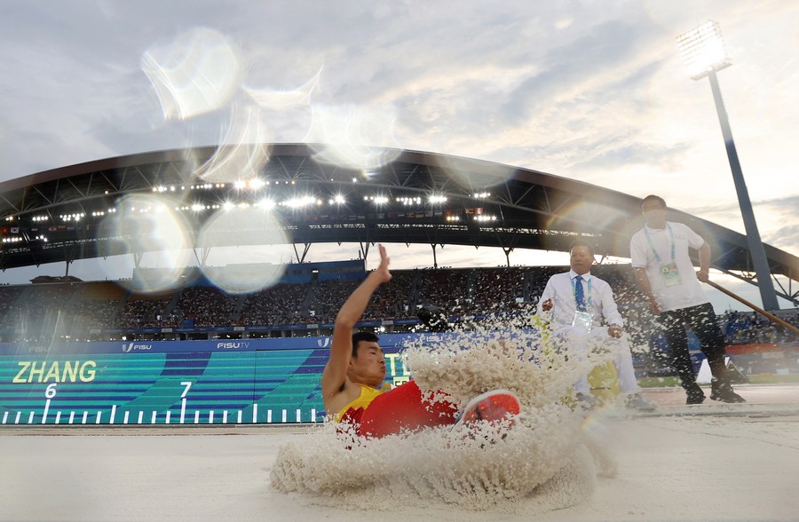 Zhang Jingqiang of China competes in the men's long jump at the Chengdu Universiade, August 6, 2023. (Xinhua/Jia Haocheng)