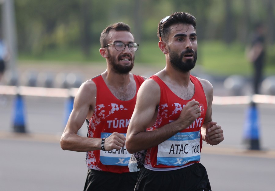 Sezgin Atac (L) and Ayetullah Aslanhan of Turkey compete in the men's half marathon at the Chengdu Universiade, August 6, 2023. (Xinhua/Jia Haocheng)