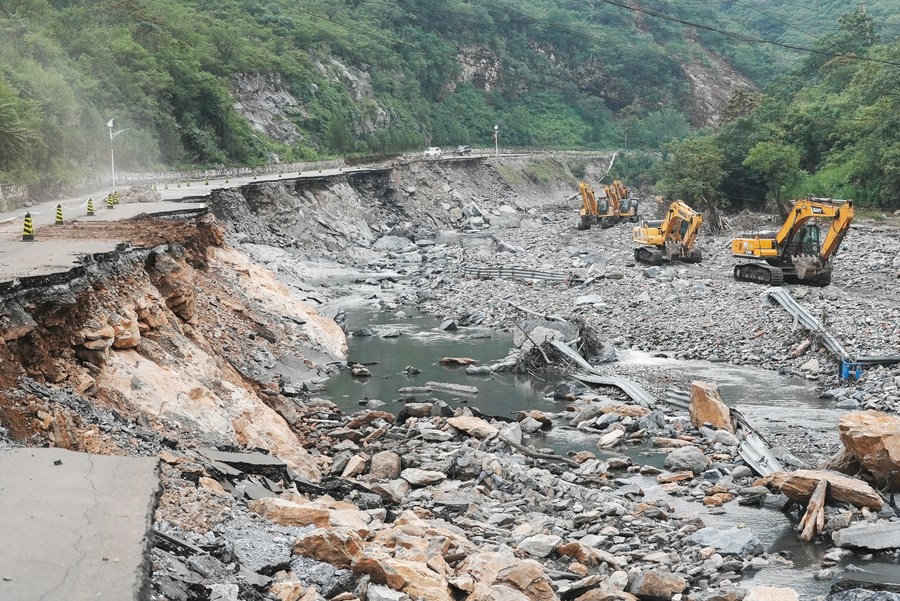 This photo taken on Aug. 6, 2023 shows large machineries moving in a watercourse to carry out restoration work in Shijiaying Town of Fangshan District in Beijing, capital of China. Beijing has been speeding up the restoration of roads damaged in flood-hit areas, to assist with rescue and relief efforts. (Xinhua/Ju Huanzong)