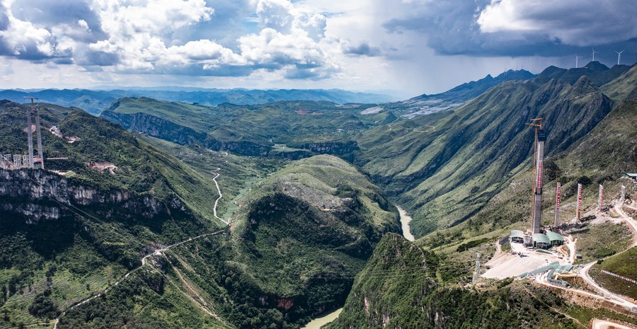 This aerial photo taken on Aug. 2, 2023 shows the construction site of the Huajiang grand canyon bridge in southwest China's Guizhou Province. With a vertical height of 625 meters from the bridge deck down to the water's surface, the Huajiang grand canyon bridge is expected to become the highest in the world after completion in 2025. It will cut the travel time across the canyon from about an hour to a mere minute. (Xinhua/Tao Liang)
