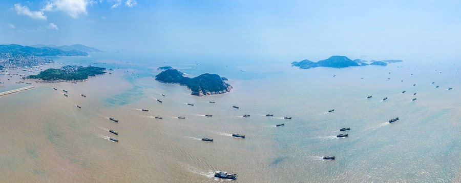 This aerial photo taken on Aug. 6, 2023 shows fishing boats setting sail for fishing from Diaobang port in Wenling City, east China's Zhejiang Province. Four types of fishing boats with special permission set sail on Sunday after a summer fishing ban, which was originally scheduled to end on Aug. 1 but has been postponed for a few days due to typhoon concerns. (Photo by Xu Weijie/Xinhua)