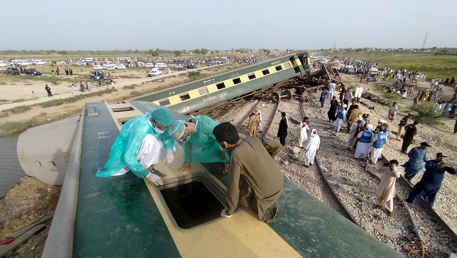 Rescuers search for victims in a derailed coach of a passenger train in Sanghar district of Pakistan's southern Sindh province on Aug. 6, 2023. At least 22 people were killed and over 50 others injured on Sunday after a passenger train derailed in the Sanghar district of Pakistan's southern Sindh province, local police said. (Str/Xinhua)